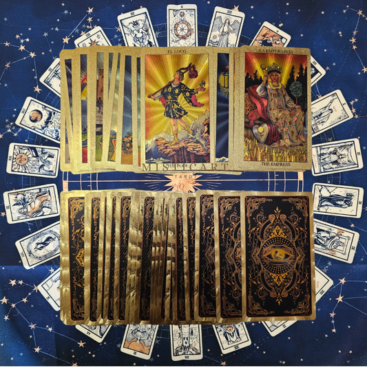 Tarot Rider Dorado Edición especial Español/Inglés + instrucciones + Guia dijital + Bolsa + Pulsera 7 nudos + Mantel tarot 50x50cm.